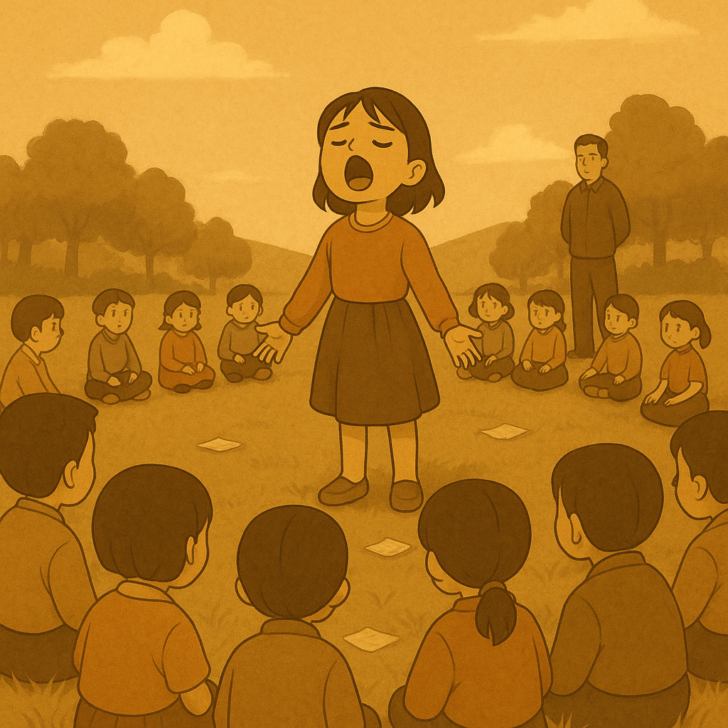 학교 앞동산에서 아디들이 둥글게 앉아있고,여자이이가 모두 앞에서 크게 노래를 부르는 장면